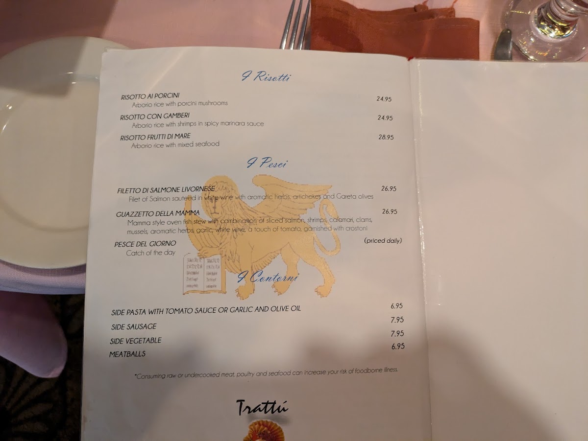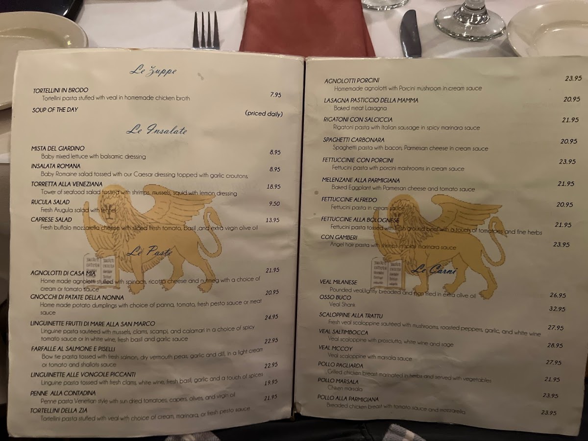 Start your meal with Le Zuppe, featuring the comforting Tortellini In Brodo, where handmade tortellini stuffed with veal is simmered in rich chicken broth. For something lighter, try the Le Insalate section, where the Torretta Alla Veneziana presents a vibrant tower of seafood salad, bursting with freshness.